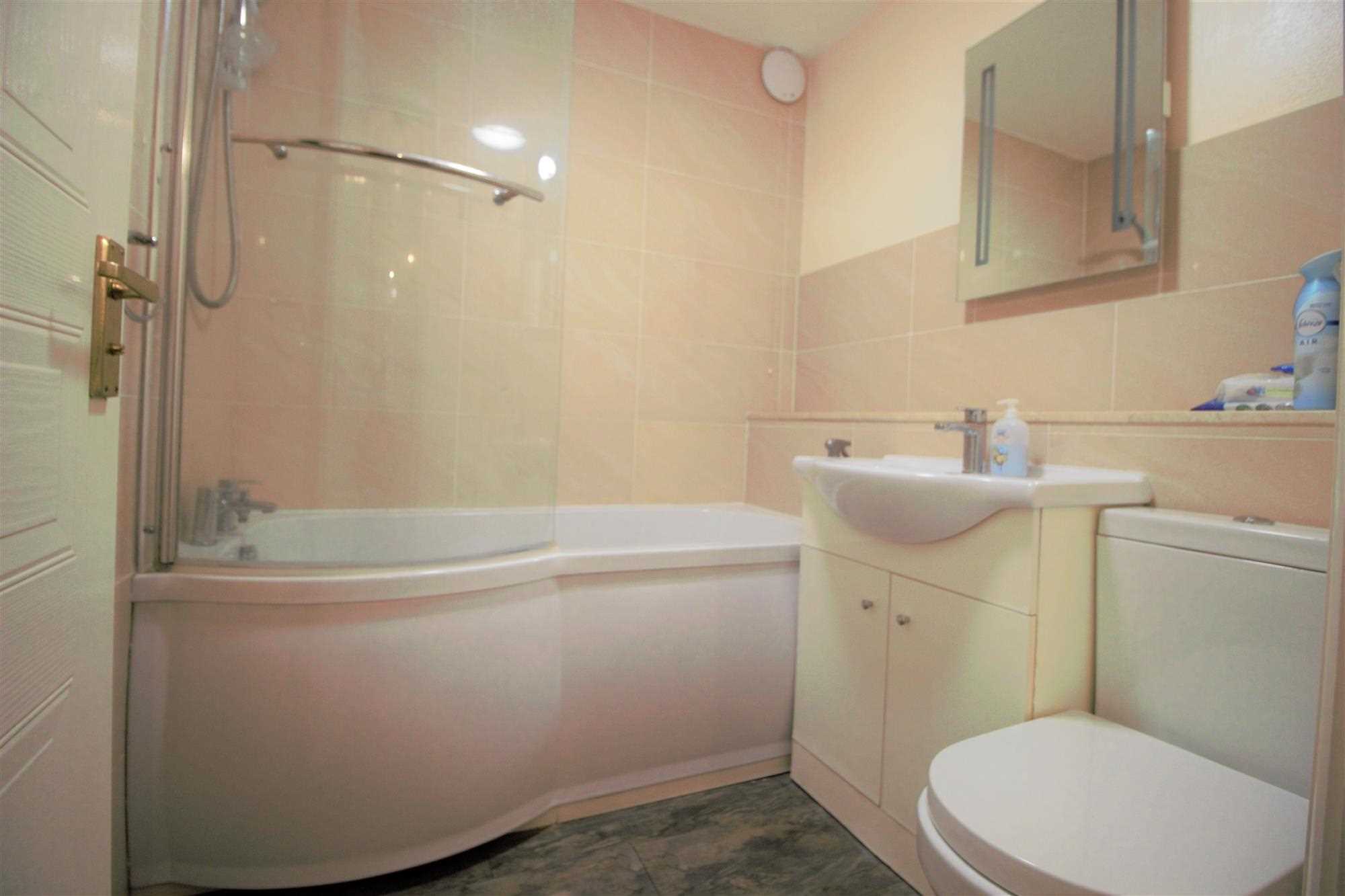 Bathroom - Panelled bath with shower over, low level WC, vanity wash hand basin, part tied walls, vinyl flooring.